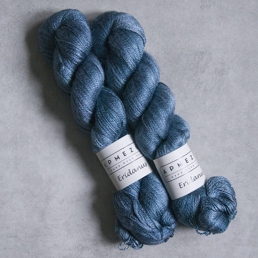Eridanus jest włóczką wykonaną z wysokiej jakości jedwabiu mulberry (jedwab morwowy). Włóczka jest ręcznie farbowana, dlatego występuje w niewielkich ilościach jeśli chodzi o pojedynczy kolor. Jak na jedwab przystało, włóczka jest połyskująca, bardzo szlachetna i z pewnością doda dzianinie luksusu. Można dziergać pojedynczą nitką, podwójną lub połączyć z innym włóknem. Bardzo popularnym połączeniem jest włóczka jedwabna z nitką moherową.