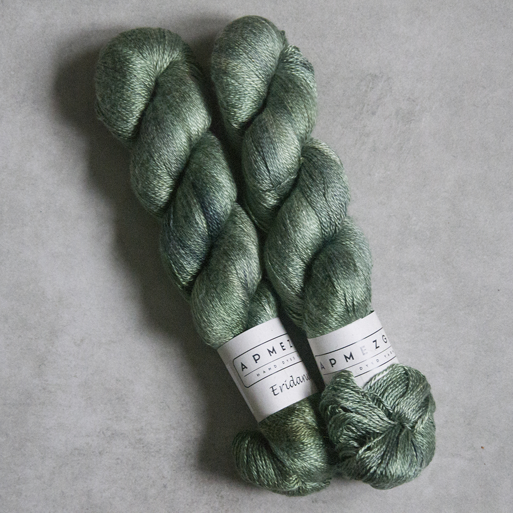 Eridanus jest włóczką wykonaną z wysokiej jakości jedwabiu mulberry (jedwab morwowy). Włóczka jest ręcznie farbowana, dlatego występuje w niewielkich ilościach jeśli chodzi o pojedynczy kolor. Jak na jedwab przystało, włóczka jest połyskująca, bardzo szlachetna i z pewnością doda dzianinie luksusu. Można dziergać pojedynczą nitką, podwójną lub połączyć z innym włóknem. Bardzo popularnym połączeniem jest włóczka jedwabna z nitką moherową.