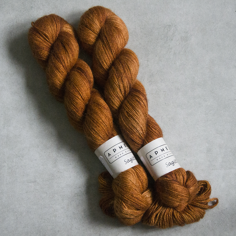 Sagitta jest włóczką litewskiej firmy Apmezga, która farbuje swoje włóczki ręcznie, dlatego każdy motek jest unikatowy. Jest to włóczka luksusowa, która składa się z wierzchniego okrycia alpaki, najszlachetniejszego jedwabiu morwowego oraz kaszmiru co nadaje jej niesamowitej miękkości. Może być przerabiana pojedynczą nitką, podwójną lub można ją połączyć z innym włóknem np. moherem. Świetnie sprawdzi się do wykonania swetrów, kardiganów, czapek, szalików, chust, bluzek, topów.