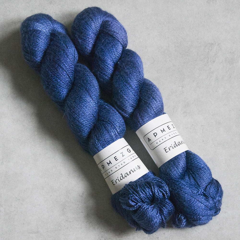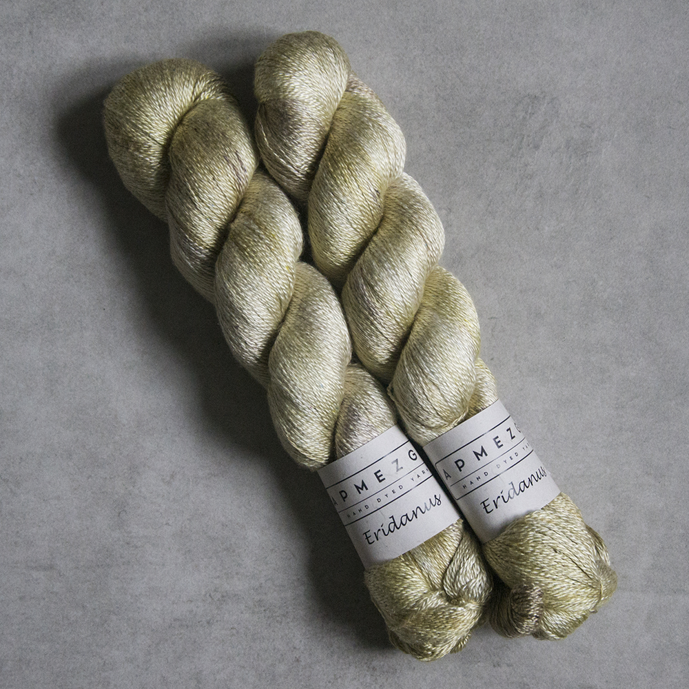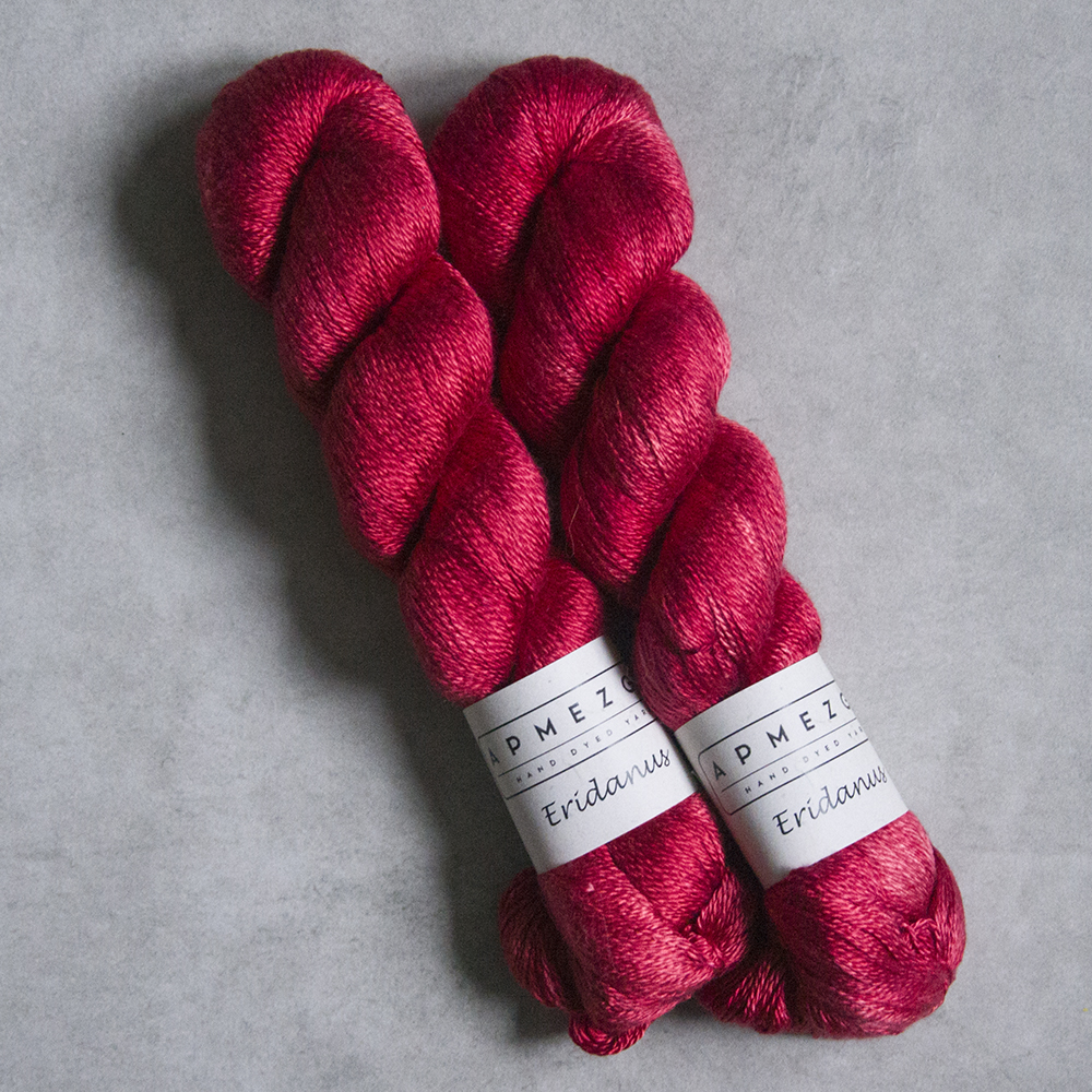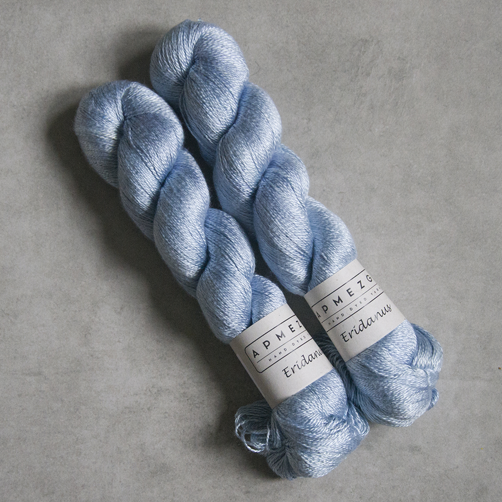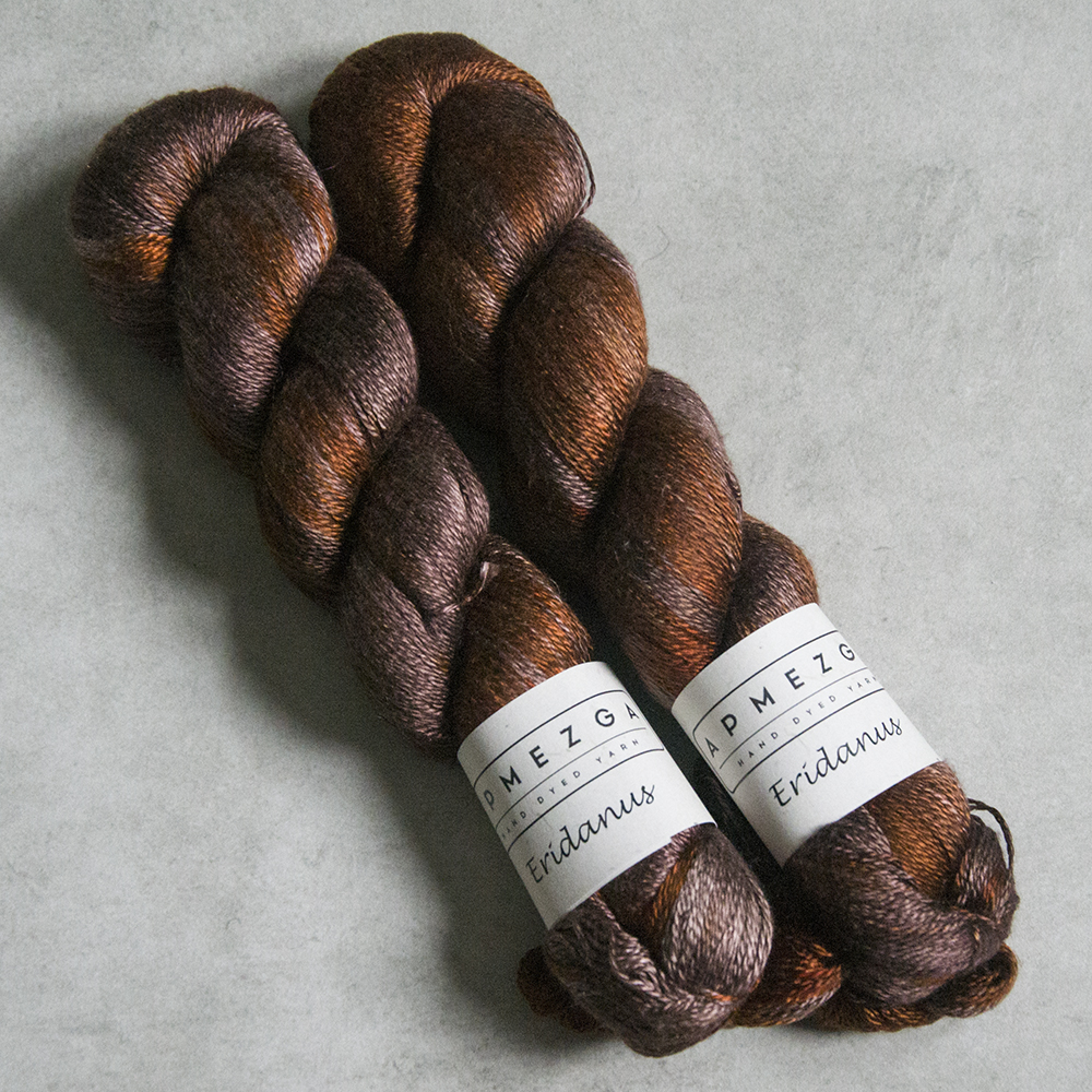 Eridanus jest włóczką wykonaną z wysokiej jakości jedwabiu mulberry (jedwab morwowy). Włóczka jest ręcznie farbowana, dlatego występuje w niewielkich ilościach jeśli chodzi o pojedynczy kolor. Jak na jedwab przystało, włóczka jest połyskująca, bardzo szlachetna i z pewnością doda dzianinie luksusu. Można dziergać pojedynczą nitką, podwójną lub połączyć z innym włóknem. Bardzo popularnym połączeniem jest włóczka jedwabna z nitką moherową.