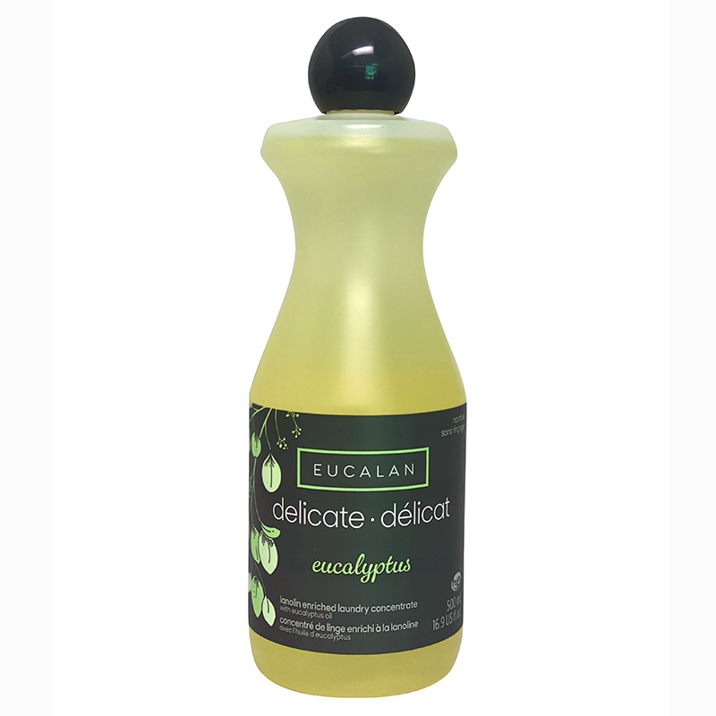 Napełnij miskę wodą o temperaturze pokojowej (nie za gorącej ani za zimnej). Dodaj Eucalan (5 ml na 4 l letniej wody). Pozostaw do namoczenia przez co najmniej 15 minut. Delikatnie ściśnij tkaninę ręcznie, aby namoczyć ją w wodzie z płynem. Nie trzeba spłukiwać. Wyjmij przedmiot z wody i delikatnie wyciśnij nadmiar wody (nie wykręcaj). Następnie postępuj zgodnie z instrukcjami suszenia.