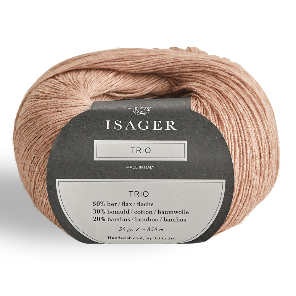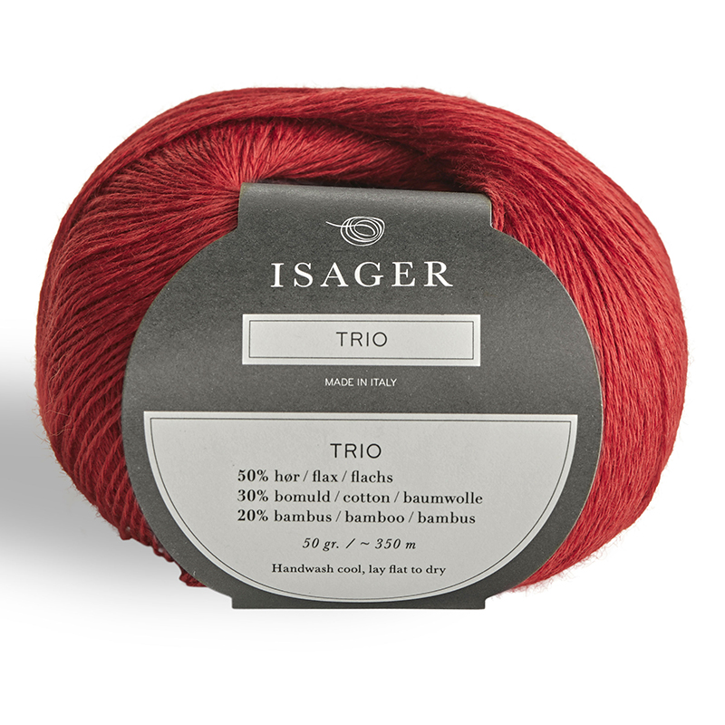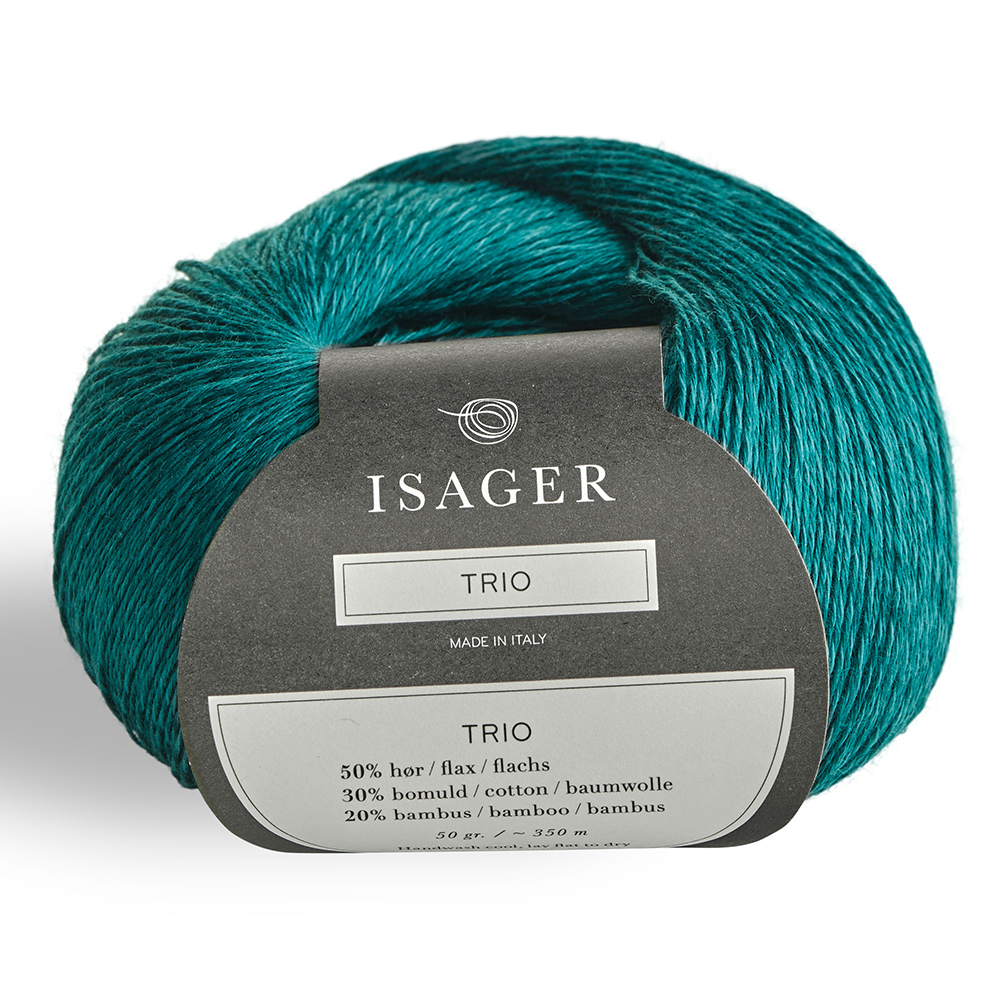Trio 1 jest cieniutką włóczką duńskiego producenta Isager, która składa się z lnu, bawełny i lyocellu. Może być przerabiana jako pojedyncza nitka lub łączona z kilku nitek lub jako nitka towarzysząca do innych włóczek. Sprawdzi się jako alternatywa dla alergików, a także jest to idealna włóczka na wiosenno-letnie projekty. Przędzona oraz farbowana jest we Włoszech.