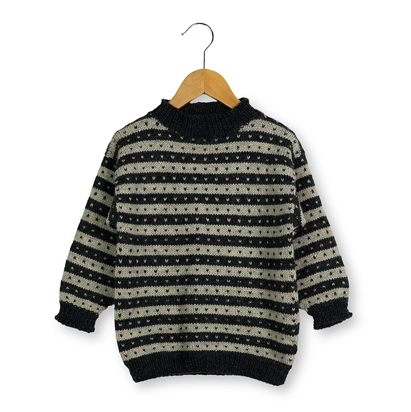 Holger's Sweater wersja dziecięca zaprojektowany przez Marianne Isager dziergany jest od dołu do góry. Wykończony jest ściągaczem przy szyi. Całość dziergana jest techniką żakardową.